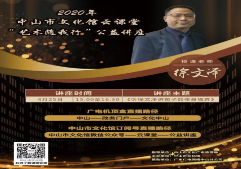 抗疫期间,应中山市政府和中山市文化广电旅游局领导的邀请,徐文泽教授还参加中山市政府为抗战疫情而精心组织的文化公益课堂,开设《听徐文泽讲荀子的修身境界》讲座。