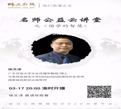 徐文泽教授积极参与珠三角企业家民间组织搭建的线上教育平台,运用互联网开展送国学优秀文化到企业职工的活动;参加广东省企业管理培训平台“师兄在线”开设的送管理文化进企业的公益课堂。徐教授在该平台讲授国学的智慧、荀子劝学思想等线上公益课程,线上同步收看人数3万多人。