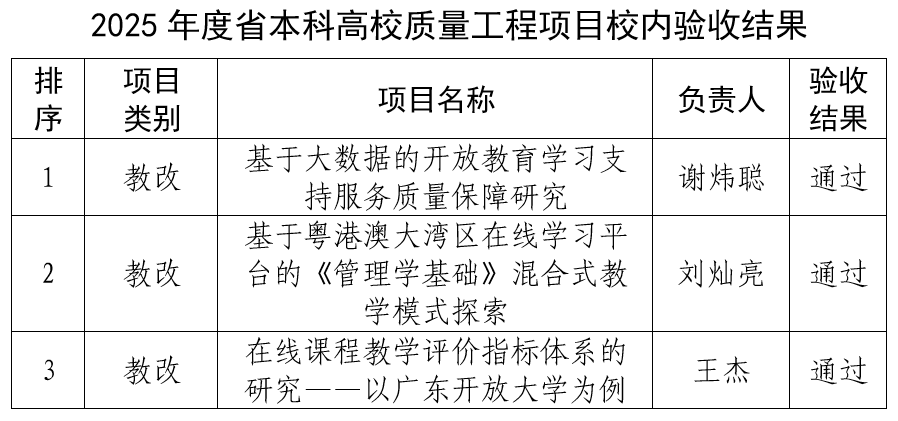 广东开放大学关于2025年度省本科高校质量工程项目校内验收结果的公示
